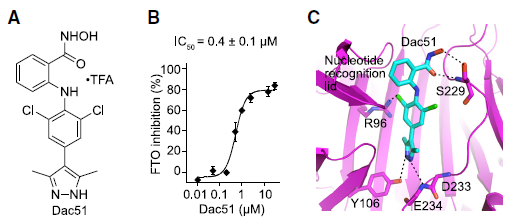 肿瘤细胞的 FTO 缺失通过增强浸润 T 细胞来抑制肿瘤生长研究人员首先分析了 TCGA 数据库的黑色素瘤(SKCM)数据,利用五个基因(CD8A, CD8B, GZMA, GZMB, and PRF1)定义了 cytotoxic T lymphocyte (CTL) score,反映肿瘤浸润 CD8+ T 细胞的功能。研究发现在表观转录组调控因子中,RNA 去甲基化酶 FTO 与 CTL score 呈现负相关。为了检测肿瘤细胞的 FTO 表达是否影响 T 细胞介导的抗肿瘤功能,研究人员在 B16-OVA 黑色素瘤细胞和肺癌细胞系 LLC 中对 FTO 进行敲降。研究人员将 B16-OVA 和 LLC 接种到小鼠体内,发现 Fto-Kd 细胞产生的肿瘤生长速度明显减慢。为进一步评估适应性免疫应答在抑制肿瘤生长中发挥的作用,研究人员将 Fto-Kd 肿瘤细胞接种在免疫缺陷 Rag2-/- 小鼠中,发现对照细胞和 Fto-Kd 的肿瘤体积相同,表明 Fto-Kd 介导的抑制肿瘤与适应性免疫应答相关。研究人员通过流式细胞术分析了肿瘤浸润的骨髓衍生细胞(单核细胞,巨噬细胞和树突细胞)和 T 细胞,发现在 Fto-Kd B16-OVA 和 LCC 肿瘤中 CD4 + 和 CD8+ T 细胞浸润明显增加。测定 IFN-γ 和 granzyme B 的产生来评估肿瘤浸润性 CD8+ T 细胞的功能,发现 Fto-Kd 肿瘤细胞 IFN-γ 和 granzyme B 阳性的 T 细胞增多。这些结果表明在肿瘤中 FTO 的缺失导致 CD8+ T 细胞浸润和其介导的细胞毒性增加。肿瘤固有 FTO 限制 CD8+ T 细胞的激活和效应状态为检测肿瘤固有 FTO 对 T 细胞的影响,研究人员对 B16-OVA 细胞和 抗原特异性 CD8+T 细胞进行共培养,随后通过流式对 CD8+ T 细胞进行分选并进行 RNA-seq。转录组分析显示,FTO 敲降导致 CD8+ T 细胞发生显著改变:1420 个基因上调和 1101 个基因下调。其中细胞因子和细胞毒性分子(IL-2, IFN-γ 和 granzyme B)的表达增加。通过对 CD8+ T 细胞效应特征基因进行基因集富集分析发现,Fto-Kd 导致 T 细胞激活并且增加了 T 细胞杀伤效果。这些结果表明肿瘤固有的 FTO 功能作为抑制因子,限制了 T 细胞的激活和效应状态。肿瘤通常利用糖酵解来促进自身快速生长,同时肿瘤细胞消耗葡萄糖会限制 T 细胞代谢,通过直接抑制其效应功能,从而促进肿瘤恶化。为检测 FTO 是否通过改变糖酵解从而限制 T 细胞的激活,研究人员测定了肿瘤细胞糖酵解的能力,发现 Fto-Kd 细胞显著降低癌细胞糖酵解的能力。研究人员通过 RNA-seq 探究 Fto-Kd 如何抑制糖酵解能力,发现在 Fto-Kd 细胞中,糖酵解途径相关基因明显下调。由于 MYC 和 bZIP 家族转录因子可以转录激活糖酵解基因,研究人员发现 Kto-Kd 细胞中 bZIP 家族转录因子 Jun,Cebpb 和 Junb 在 RNA 和蛋白水平均发生下调。为了验证转录因子与 T 细胞活化的关系,研究人员在 Fto-Kd 细胞中过表达 Junb,发现抑制了 T 细胞活化,而使用 2-DG 阻断肿瘤糖酵解后,抑制的 T 细胞活化明显被恢复。这些结果表明 Fto-Kd 通过抑制糖酵解转录因子导致 T 细胞活化增强。FTO 通过 m6A 依赖的方式调控 bZIP 转录因子为进一步探究 FTO 与转录因子之间的调控关系,研究人员对 B16-OVA 肿瘤细胞进行 M6A-seq。通过计算每个峰 m6A 比率,研究人员发现 Fto 敲降导致 m6A 甲基化整体增加。研究人员进一步挑选了 83 个 FTO-m6A 直接调控基因进行 GO 分析,发现 DNA 结合和转录激活显著富集,包括 bZIP 转录因子 Jun 和 Cebpb。为了分析这些 mRNA 中 m6A 增加是否与 FTO 直接相关,研究人员在肿瘤细胞中过表达了 CRISPR-dCas13 融合蛋白,发现在 gRNA-Cebpb-JunB 和 dCas13b-FTO 共转染时,JunB 和 C/EBPβ 及下游糖酵解基因显著上调,这些结果表明 FTO 通过去甲基化 Junb 和 Cebpb 来调控下游糖酵解基因。已有报道表明 FTO 抑制剂具有明显的抗肿瘤效果,然而目前还没有研究探究在免疫肿瘤微环境中使用 FTO 抑制剂激活 T 细胞。因此,研究人员优化了 FTO 抑制剂得到了 Dac51。体外实验表明,Dac51 对 FTO 去甲基化活性具有良好的抑制活性。此外,研究人员还测定了 FTO 和 Dac51 配合物的晶体结构,发现 Dac51 的异羟肟酸与 Ser229 之间存在额外的氢键,可能导致 Dac51 与 FTO 的结合显著增强。Dac51 处理与 Fto 敲降对糖酵解代谢的抑制水平相似。这些结果表明 Dac51 可以作为一种有效的 FTO 抑制剂,通过抑制 FTO 介导的 Jun 和 Cebpb 转录本的去甲基化,抑制肿瘤细胞的糖酵解能力。