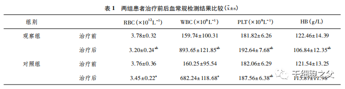 ①血常规变化:经治疗后,观察组患者血常规红细胞计数(RBC)、白细胞计数(WBC)、血小板计数(PLT)、血红蛋白(HB)分别为[(3.20±0.24)×1012/L]、[(893.65±121.85)×109/L]、[(192.64±7.68)×109/L]、[(106.84±12.35)g/L],与治疗前相比差异具有统计学意义(t=9.40,30.14,7.08,5.34;P0.05),且治疗后显著优于对照组(P0.05);详情见表1