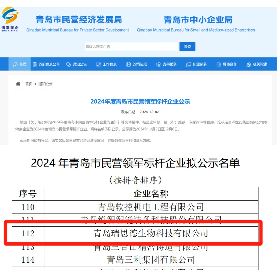 近日,青岛市民营经济发展局发布了2024年度青岛市民营领军标杆企业公示名单,经过严格的企业申报、区市推荐、专家评审等程序,青岛瑞思德生物科技有限公司连续两年成功入选。
